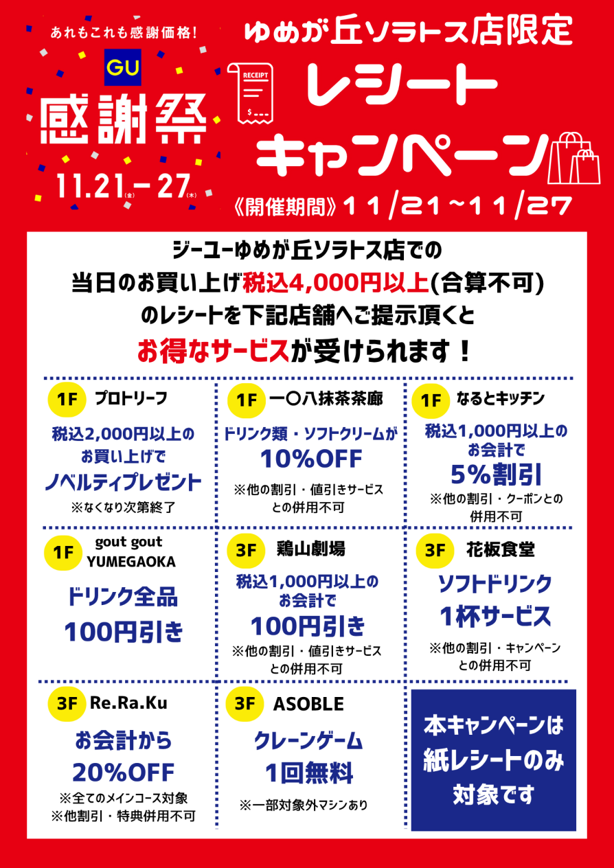 ジーユーゆめが丘ソラトス店限定!感謝祭レシートキャンペーン開催中